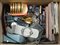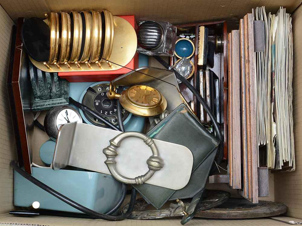 Cartone contenente numerosi oggetti principalmente per la scrivania (difetti)