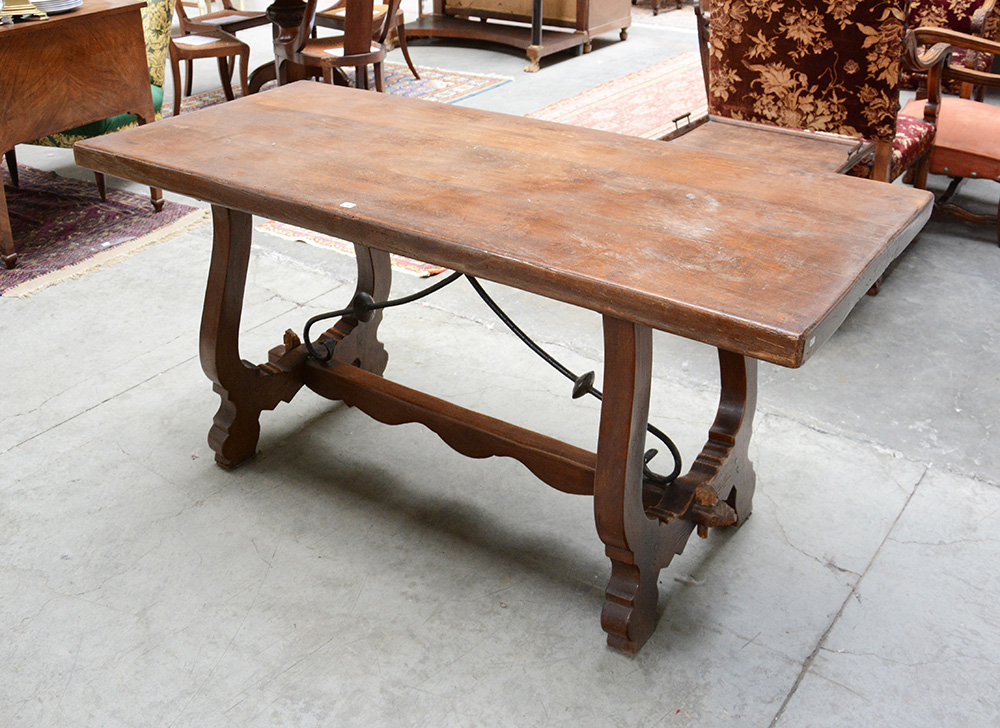 Tavolo in stile seicentesco spagnolo con sostegni a lira riuniti da traversa ed elementi in ferro battuto (cm 159x78x69) (difetti)