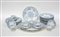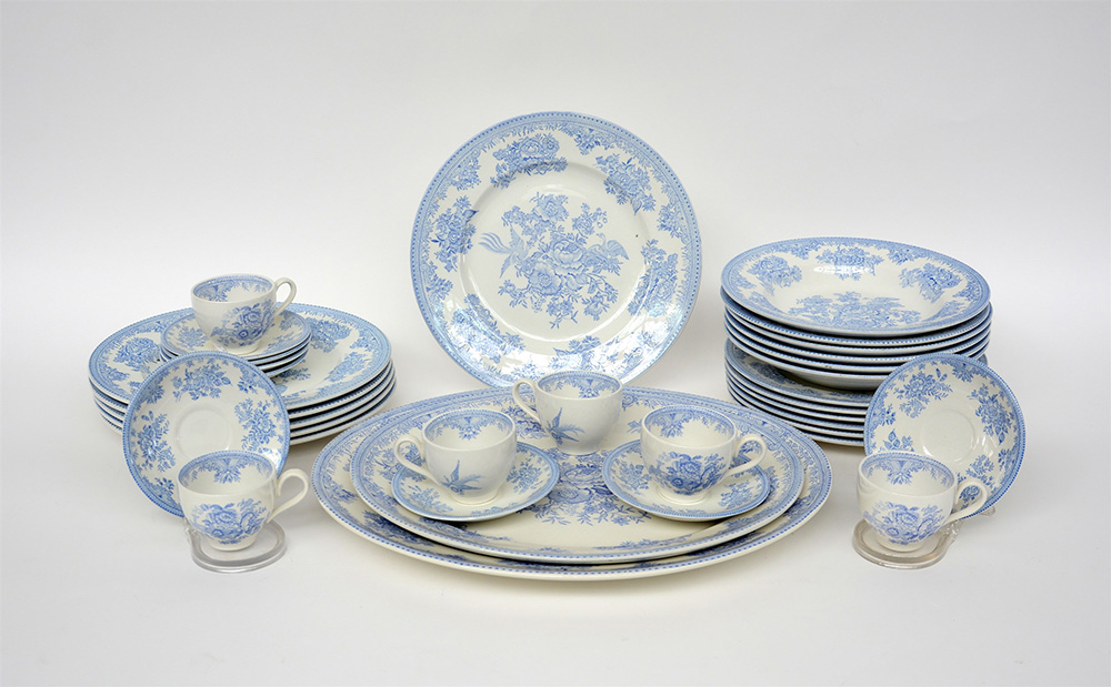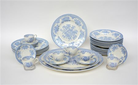 Manifattura inglese, servizio da tavola in ceramica a decoro naturalistico monocromo celeste, composto da sei piatti fondi e sei piani, sei piatti da frutta e due da portata ovali, sei tazzine con otto piattini (lievi difetti)