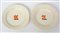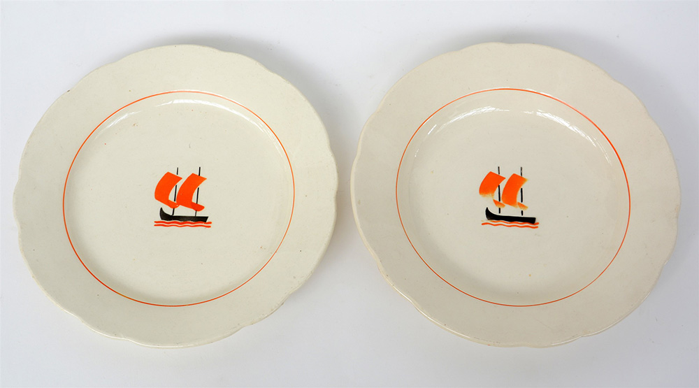 Lotto di un piatto piano e uno fondo decorato con veliero in arancio e nero. Laveno, anni '30.
