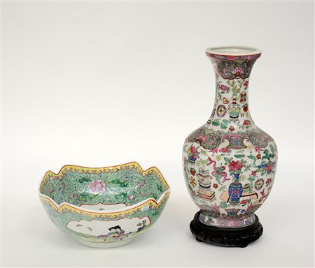 Lotto composto da un vaso e una ciotola in porcellana Famiglia Rosa, marchio...