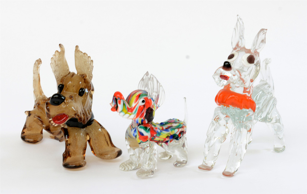Lotto di tre schnautzer/terrier in vetro soffiato di diversi colori e tecnica esecutiva. Seconda metà secolo XX. (h max cm 18) (difetti)
