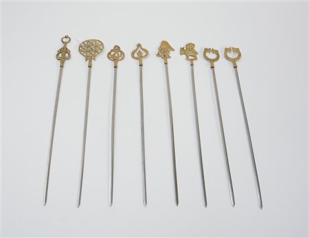 Gruppo di otto stecchi da spiedini con prese in ottone di forme differenti...