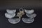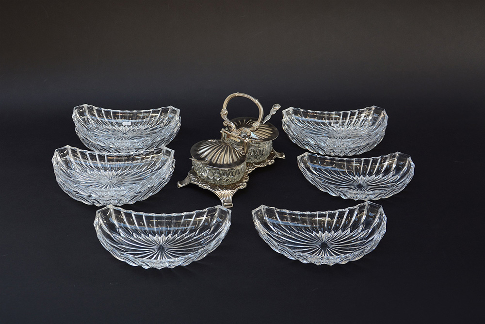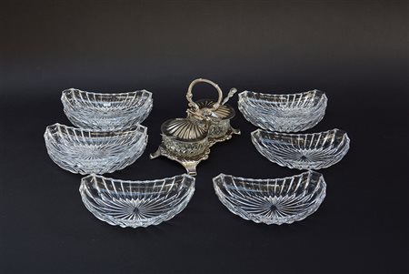 Lotto composto da nove antipastiere a semilune in cristallo sfaccettato ed una formaggiera con struttura in metallo e coppette in cristallo (difetti)