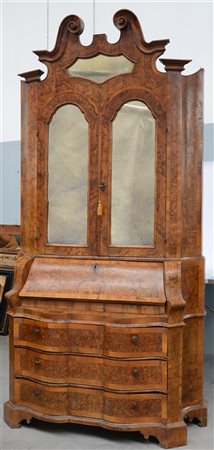 Trumeau in stile veneto lastronato in radica a dua ante a specchio celanti vani e cimasa di linea spezzata decorata al centro da specchio. Parte inferiore con anta ribaltabile celante quattro cassettini e vani, fronte a tre cassetti di forma mossa, piedi a mensola (cm 125x243x50) (difetti)