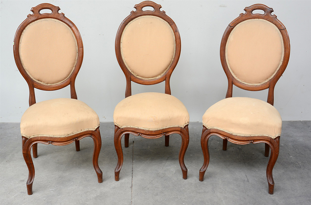 Gruppo di tre sedie in mogano con schienale sagomato.Gambe mosse, sec. XIX...