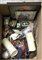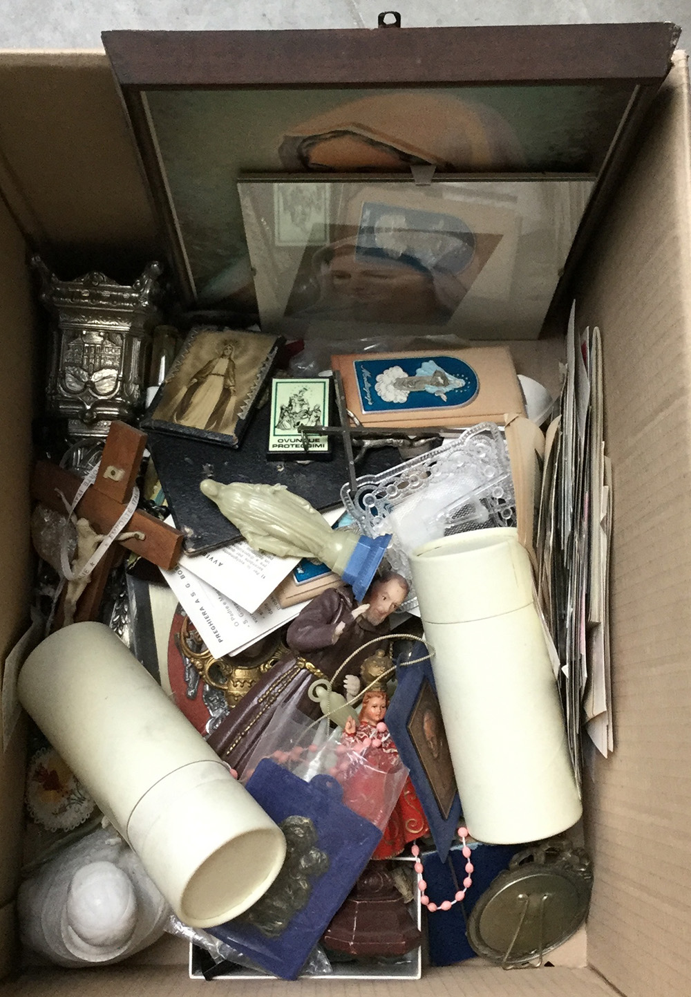 Cartone contenente numerosi oggetti devozionali per il culto cristiano (difetti)