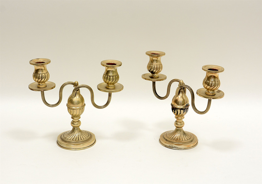 Coppia di doppieri in argento con fusto baccellato, bracci a doppia voluta scanalati. Italia, metà secolo XX (difetti) (g 770 ca) (h. cm 19,5)