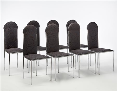 Otto sedie in tubolare metallico cromato con sedile e schienale imbottiti e rivestiti in tessuto grigio con decorazioni in velluto marrone a volute. Italia, produzione recente.