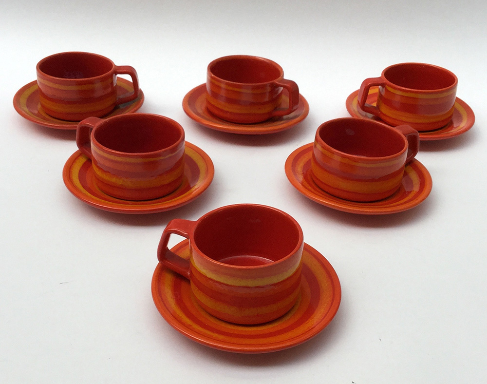 Servizio da tè in ceramica, composto da sei tazzine e piattini firmato Baldelli. Italia 1940 circa