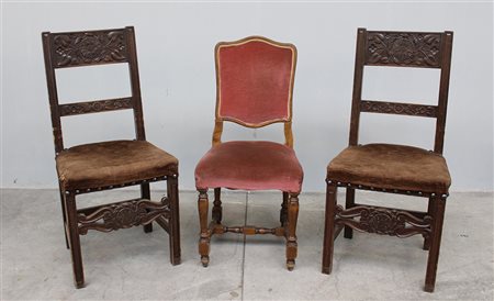 Lotto composto da una coppia di sedie in stile seicentesco con schienale a giorno e cartelle intagliate ed una sedia con seduta e dorsali in velluto rosso (difetti)