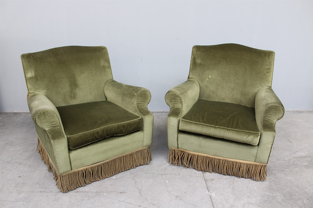 Coppia di poltrone rivestite in velluto verde con passamaneria a frange (difetti)