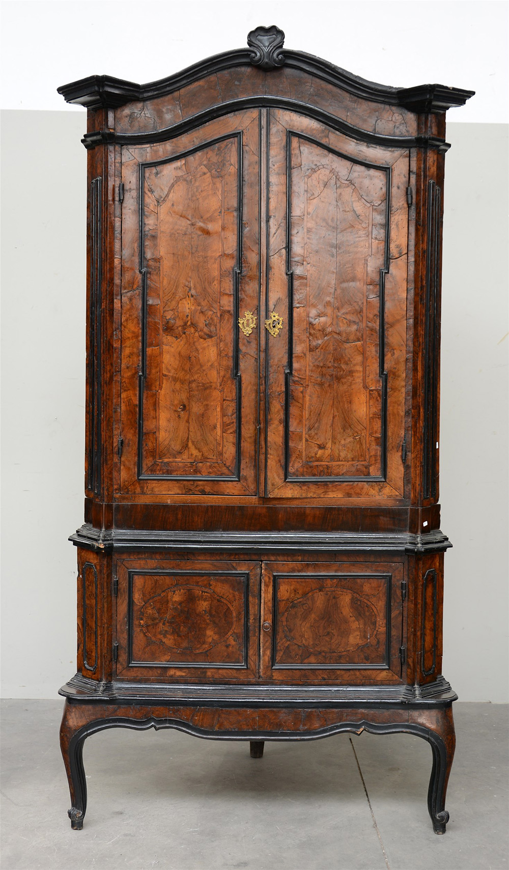 Mobile a due corpi ad angolo in noce e piuma di noce decorato con sagomette ebanizzate in rilievo. Parte inferiore a due ante riquadrate, parte superiore di struttura architettonica con due ante sagomate. Lombardia sec. XVIII (cm 107x210x70) (difetti e restauri)