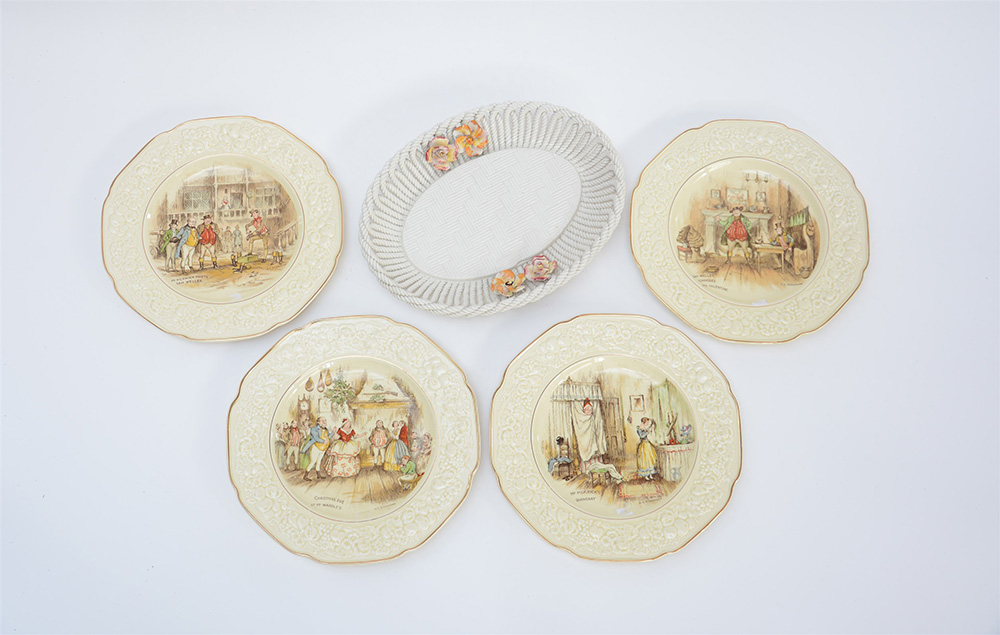 Lotto composto da un cestino in ceramica di Bassano e quattro piatti decorativi inglesi dipinti con scene di genere (lievi difetti)