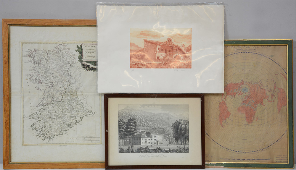 Lotto composto da un'incisione del secolo XVIII di Antonio Zatta raffigurante una parte del Regno d'Irlanda, una del secolo XIX raffigurante una veduta di Villa d'Este sul lago di Como e una mappa azimutale in cornici, cui si unisce una litografia monocroma in busta, misure differenti (difetti)