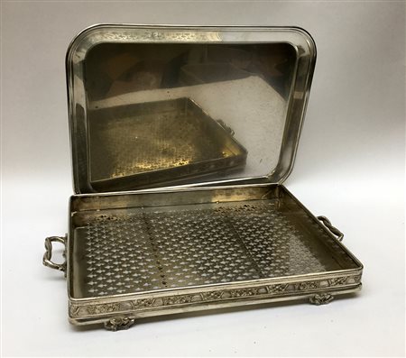 Grande scaldavivande biansato con vassoio in metallo argentato, bordo decorato con tralci di vite in rilievo. Fondo traforato a motivo di giglio stilizzato (cm 65x41)