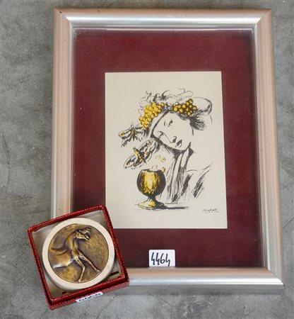 Lotto composto da una serigrafia su metallo da un disegno di Domenico Purificato, in cornice, e un fermacarte in travertino con bassorilievo in metallo firmato Cassinari. Edizioni Spirale Arte