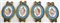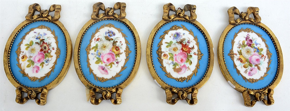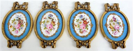 Gruppo di quattro placche in porcellana dipinte in policromia a fiori entro cornici a volute dorate. Cornici in bronzo dorato e decorato a fiocchi (h cm 12). Francia, fine sec. XIX
