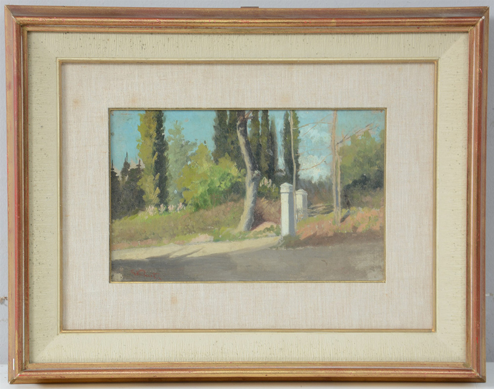 Firma indecifrata, "Paesaggio boschivo con cancello" olio su tela applicata su cartoncino (cm 16,5x26) firmato in basso a sinistra, in cornice