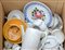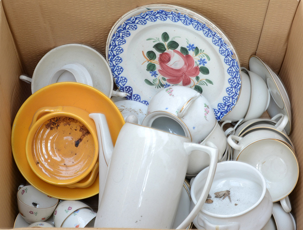 Cartone contenete numerosi oggetti per la tavola in ceramica (difetti)