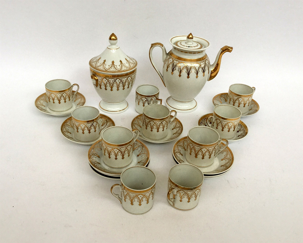 Servizio da caffè in porcellana decorato con archi polilobati e profili dorati, composto da caffettiera, zuccheriera, dieci tazze con dodici piattini (difetti)