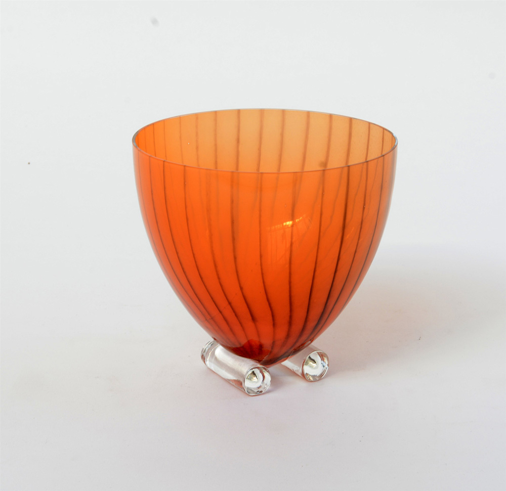 Vaso in vetro incolore e a canne arancioni. Seconda metà secolo XX.