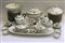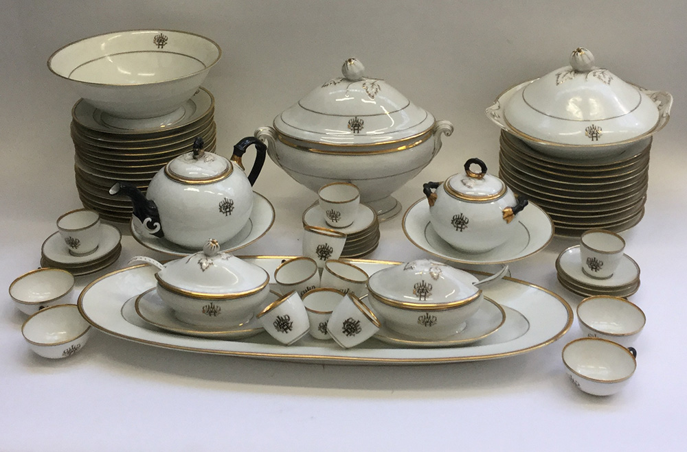 Servizio da tavola in ceramica profilata in oro e con monogramma di albergo, composto da dodici piatti fondi e quarantanove piani, ventinove piatti da frutta, otto alzatine di differenti altezze, sette piatti da portata di differenti dimensioni e due raviere, due salsiere, insalatiera, zuppiera e legumiera con coperchio, sette tazze da tè con otto piattini, sedici tazzine con quindici piattini, teiera e zuccheriera (difetti)