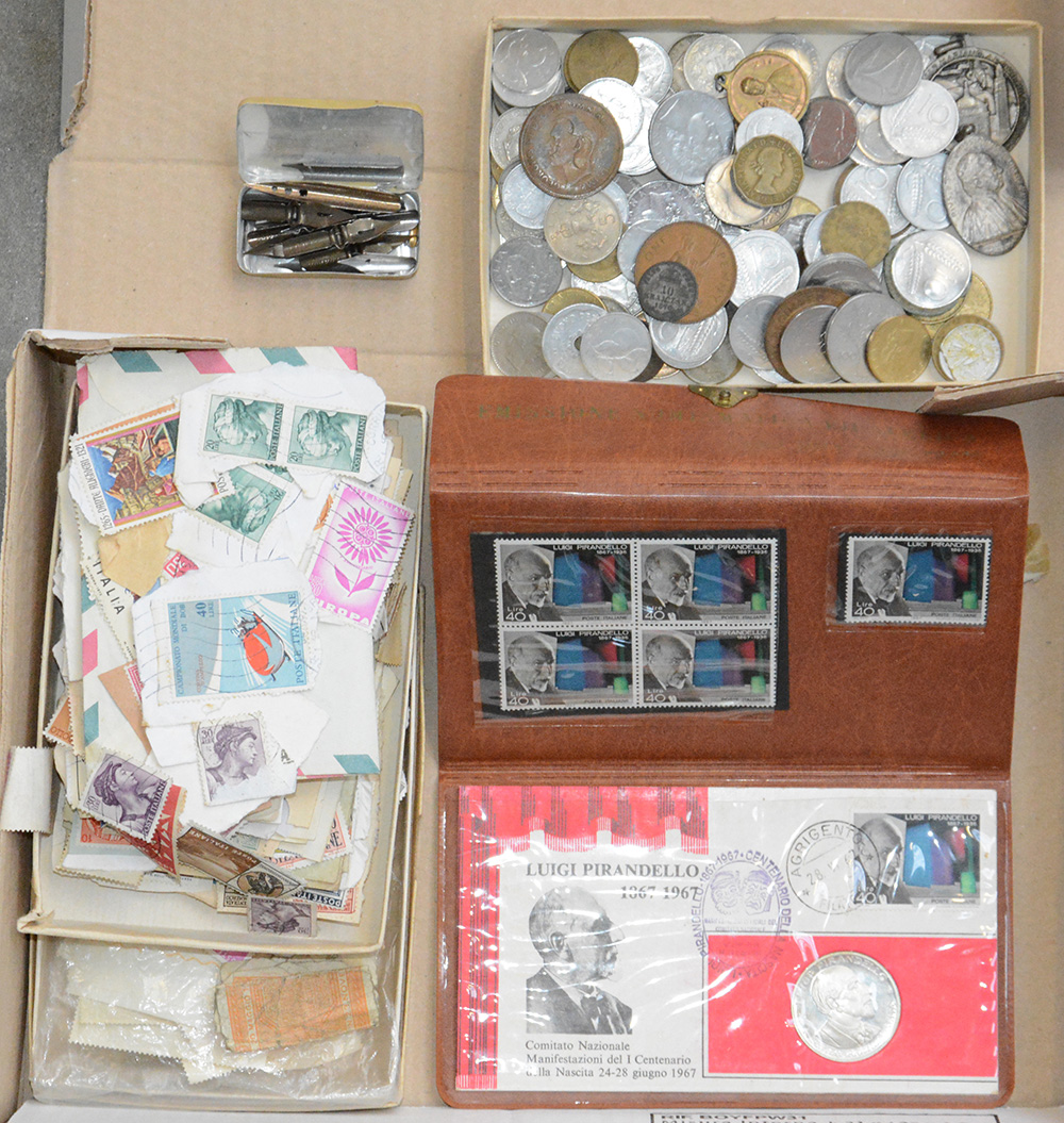 Scatola contenente monete, francobolli, pennini e vari altre curiosità