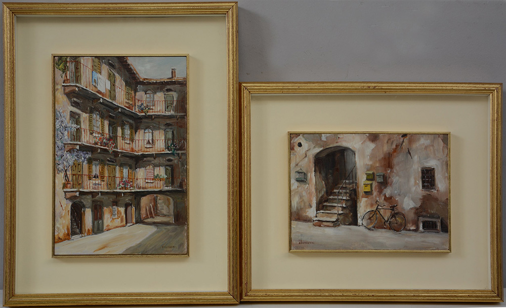 Cocchetti "Case di ringhiera" due dipinti ad olio su masonite, firmati....