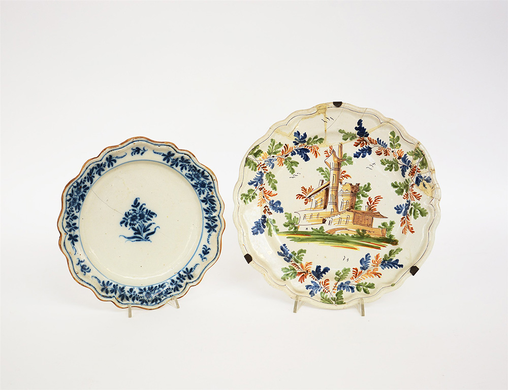 Lotto di due piatti in maiolica del secolo XVIII di misure diverse. (difetti e restauri)