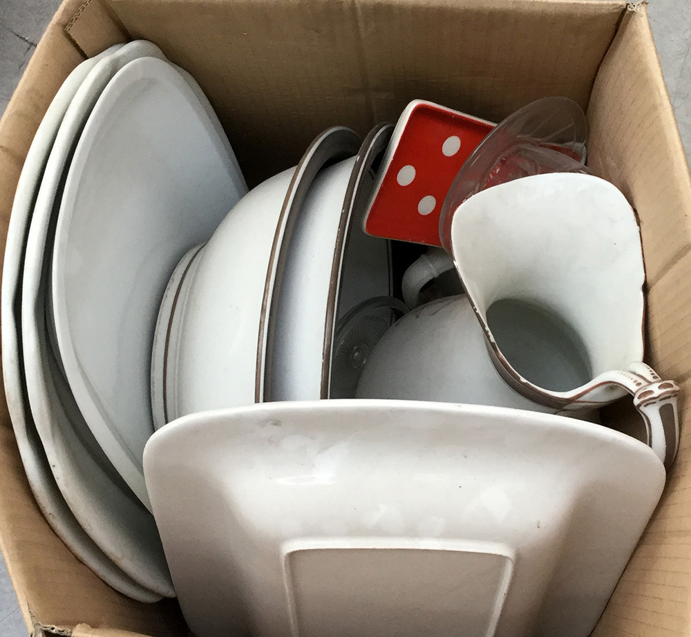 Cartone contenete numerosi oggetti per la tavola in ceramica (difetti)