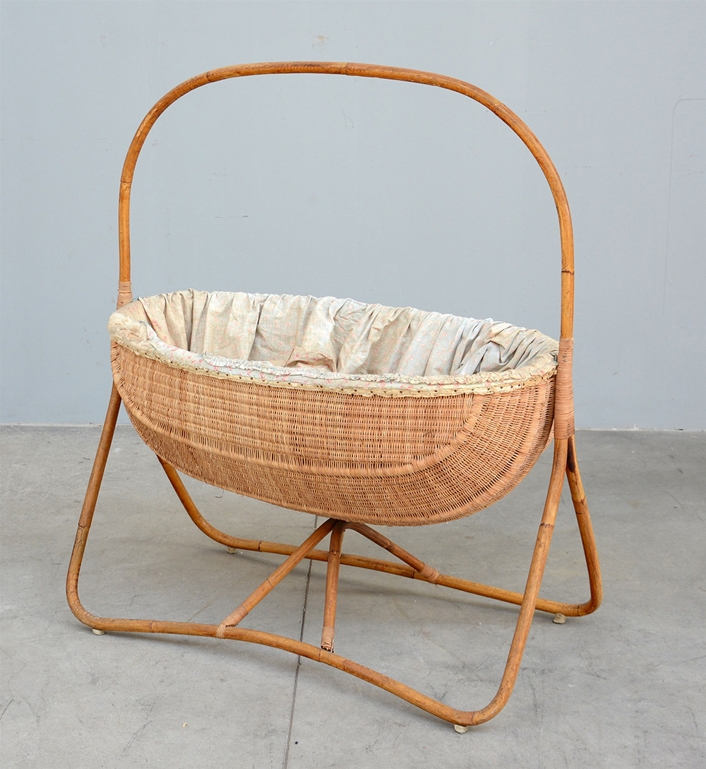 Culla per neonati in giunco e malacca. Produzione Italiana, anni '50. (cm 103x118x58) (difetti)