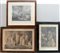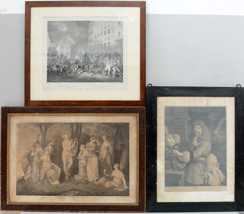 Lotto di tre stampe diverse del secolo XIX raffiguranti un ritratto di gentiluomo, una scena mitologica e una scena di battaglia. Misure differenti, una in cornice dell'epoca (difetti)