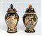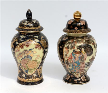 Lotto di due potiches in ceramica dipinta in policromia con fiori e scene di vita, fondo blu e nero, decorazione con figure in rilievo (lievi difetti)