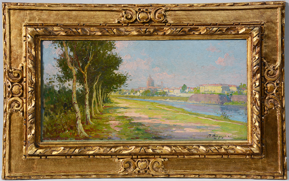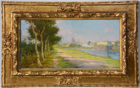 Romeo Borgognoni (Ravenna 1875 - Pavia 1944)"Paesaggio fluviale" olio su...