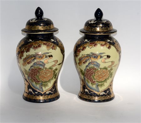 Coppia di potiches in ceramica dipinta in policromia con fiori e uccelli, fondo blu con draghi e rilievi dorati (lievi difetti)