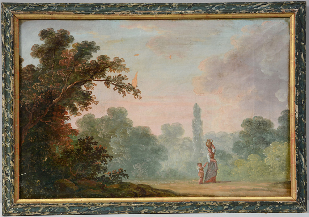 Scuola del secolo XIX, "Paesaggio con acquaiola e figlio" olio su tela (cm 42x63) in cornice (difetti)
