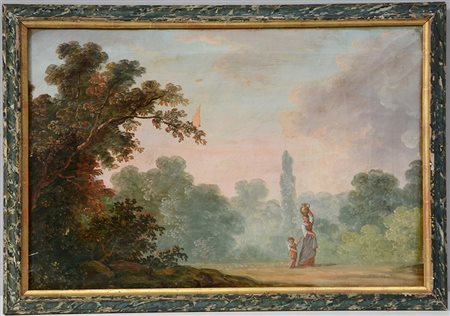 Scuola del secolo XIX, "Paesaggio con acquaiola e figlio" olio su tela (cm...