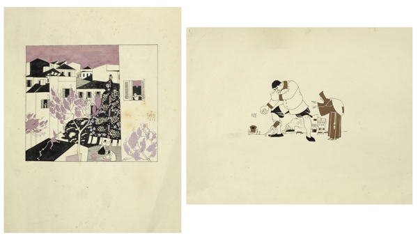 Piero Bernardini (Firenze, 1891 - 1974) A) Il gigante, 1923, cm. 40x30 (foglio), China e tempera su carta. Firma e data a sinistra nella composizione. B) Paesaggio con figure, 1923, cm. 40x30 (foglio), China e tempera su carta. Firma e data a destra nella composizione. € 150/250