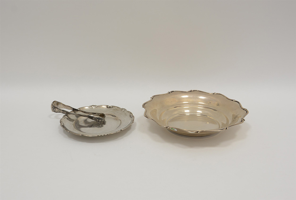 Lotto composto da ciotola piattino e pinza in argento (g 420 ca.) (d. max cm 80)