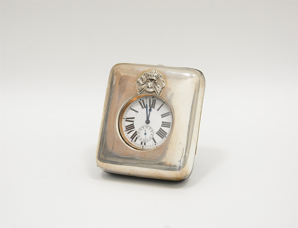 Portaorologio con copertura in argento liscia e applicazione commemorativa. Londra, 1900. Argentiere William Comyns (cm 10x11); Orologio in metallo, quadrante in smalto bianco e numeri romani, Fine '800 inizi '900 (difetti)
