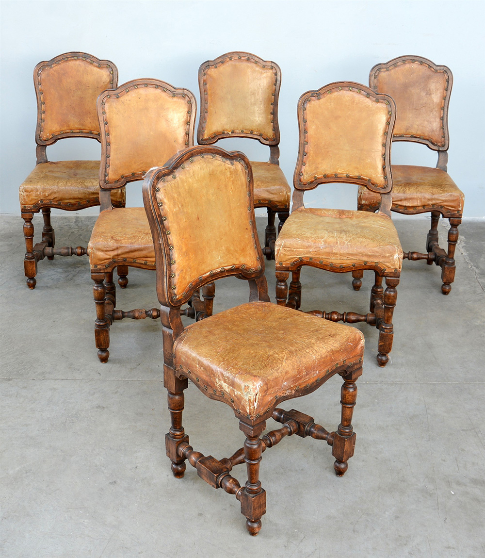 Gruppo di sei sedie con schienale sagomato, gambe e traverse tornite a rocchetto rivestite in pelle. Secolo XVIII (difetti e restauri)