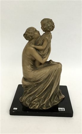 "Amor materno". Scultura in gesso patinato poggiante su base in legno laccato (h cm 40) (difetti)