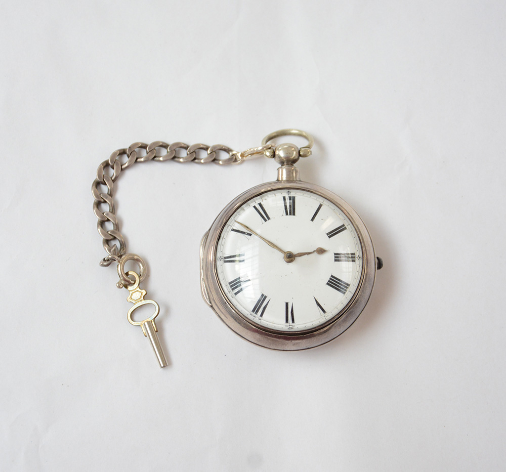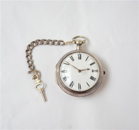 Orologio da tasca a doppia cassa in argento, quadrante in smalto bianco a numeri romani, movimento con scappamento a verga