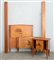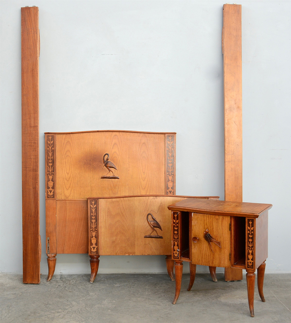 Lotto composto da un letto a una piazza in legno dolce decorato con lesene intarsiate e pellicani, e un comodino en suite, fine anni ‘30 (difetti)