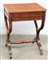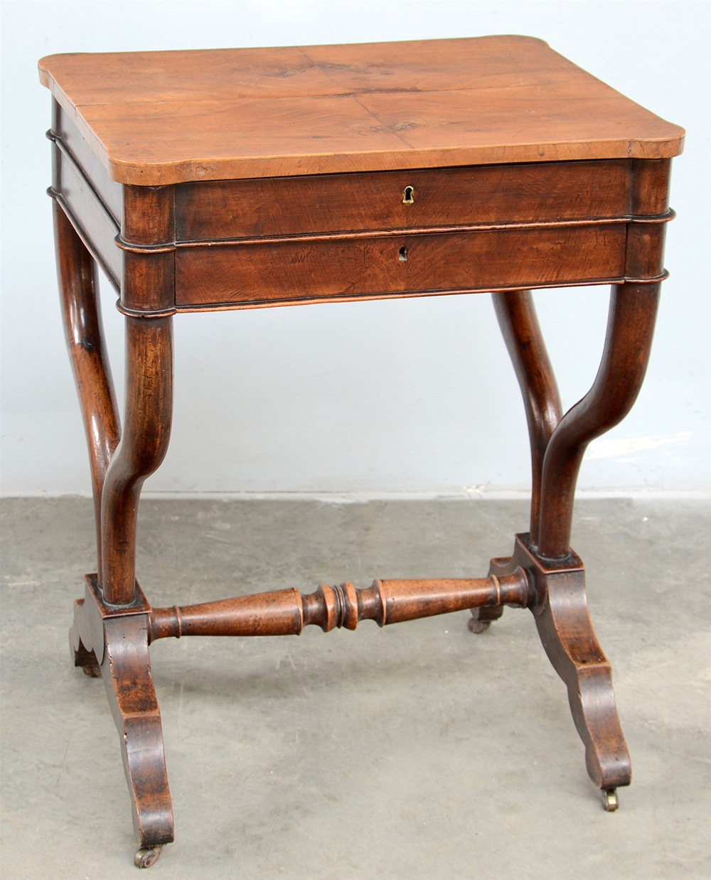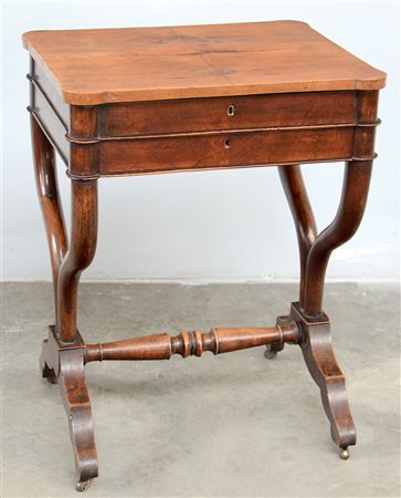 Tavolino da lavoro in noce con gambe mosse riunite da traversa, piedi con rotelle. Secolo XIX (cm 55x72x45) (difetti)