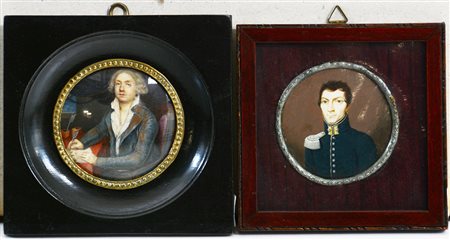 Lotto di due miniature tonde raffiguranti gentiluomini, secolo XIX (d cm 6) in cornici (lievi difetti)