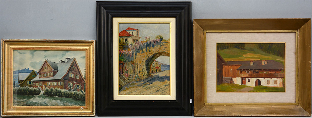 Lotto di due dipinti ad olio e un acquerello raffiguranti scorci con edifici, autori e misure differenti, in cornici (difetti)
