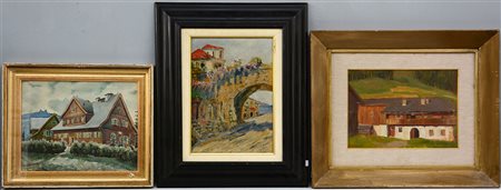 Lotto di due dipinti ad olio e un acquerello raffiguranti scorci con edifici,...