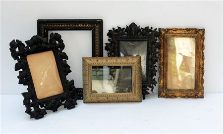 Gruppo di cinque cornici in legno di fatture e dimensioni differenti (difetti)